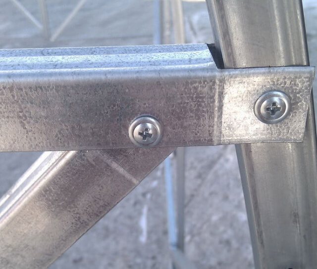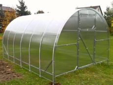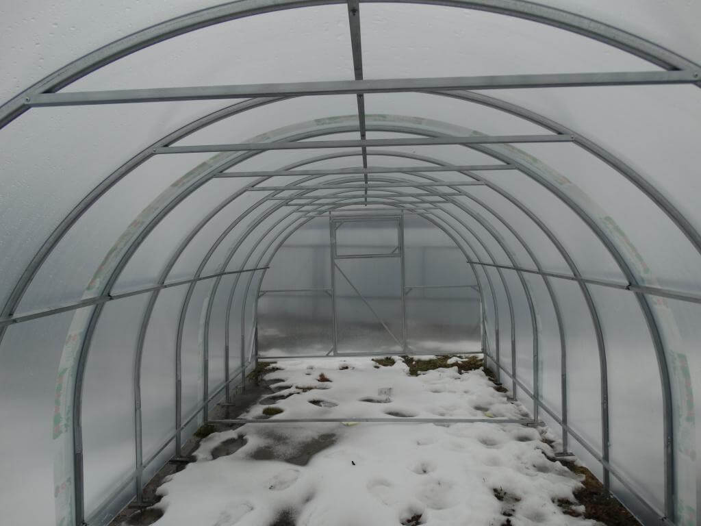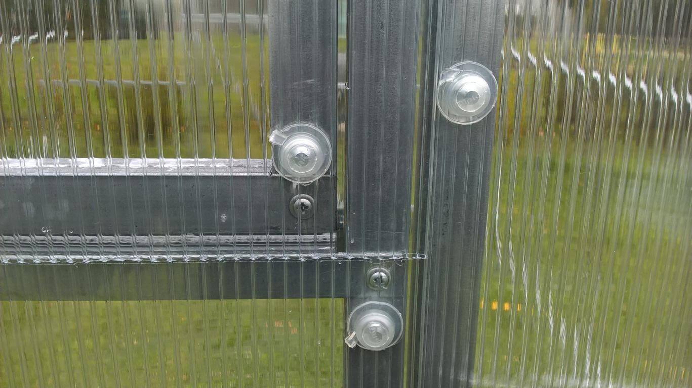 – Поликарбонат крепится на каждой арке оцинкованной стальной лентой (не продавливается и не портится поликарбонат. На стыках плотно прижимаются листы и не затекает вода -не нужен стыковочный профиль)