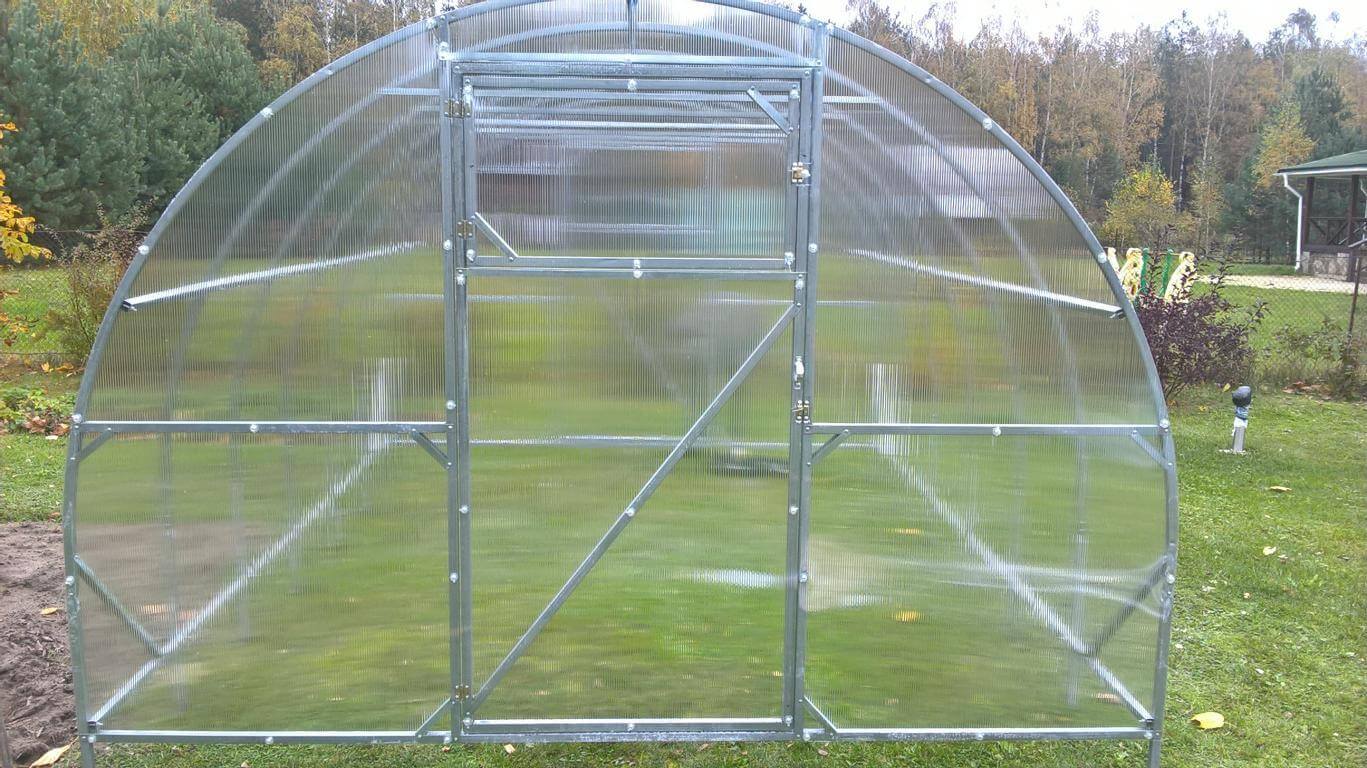 Для облегчения сборки теплицы торцы, двери, форточки изготавливаются и поставляются цельными. Для обеспечения жесткости всего каркаса промежуточные арки теплицы производятся и поставляются цельногнутыми. Продольные стрингера производятся и поставляются в двух позициях: 2 метра и 2,08 метра соответственно. Для достижения прочности всего каркаса -предусмотрены поперечные усилители арок, из расчета по 1 штуке на каждой арке. Во избежания наклона торцов каркаса при ветровых нагрузках – предусмотрены поперечные раскосы, по 4 штуки на стороны каждого торца. Все необходимы элементы (саморезы, болты, гайки и т.п) поставляются в коробках. Для крепления сотового поликарбоната к каркасу теплиц предусмотрены стальные оцинкованные стяжные ленты со стяжным болтом, из расчета по одной ленте на каждую дугу.