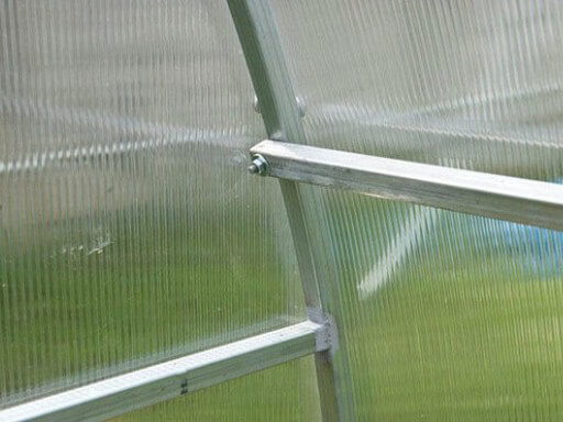 Арочный каркас теплицы изготовлен из профильной трубы квадратного сечения 40×20 мм. С торцов теплицы установлены двери и форточки, фиксирующиеся в открытом и закрытом положении. Усиленные арки соединены девятью прогонами.