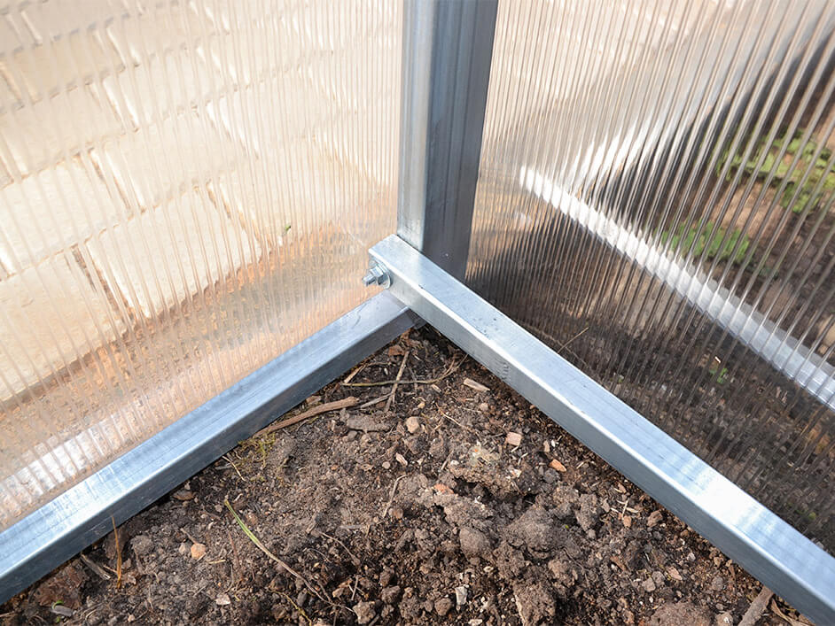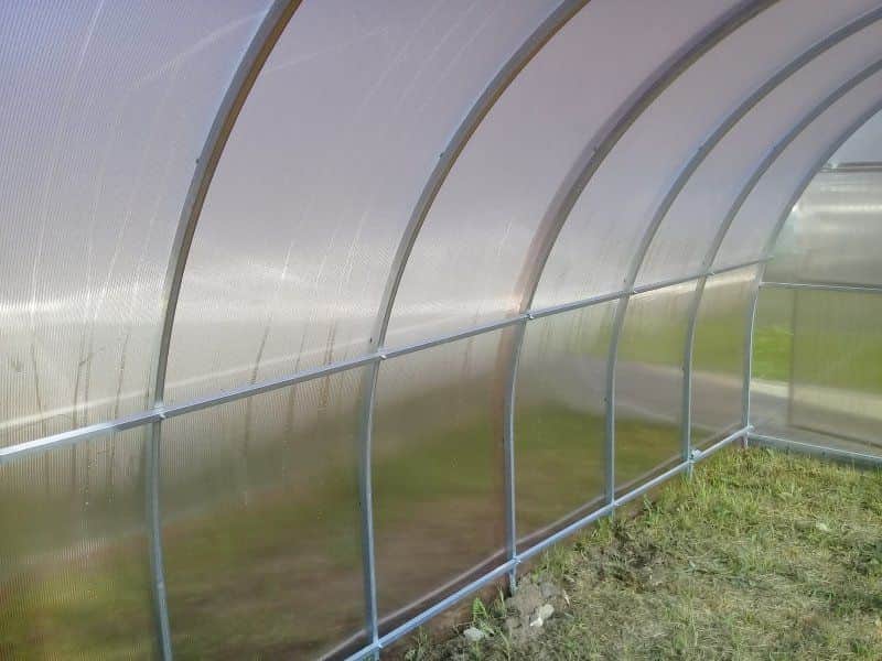Арочный каркас теплицы изготовлен из профильной трубы квадратного сечения 20×20 мм. С торцов теплицы установлены двери и форточки, фиксирующиеся в открытом и закрытом положении. Усиленные арки соединены девятью прогонами.